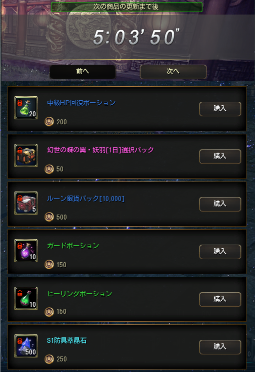 2.毎日0時、6時、12時、18時に、ミステリーショップに6個の商品が更新されます。商品が更新されると、画面の上部に次回更新までの残り時間が表示されます。